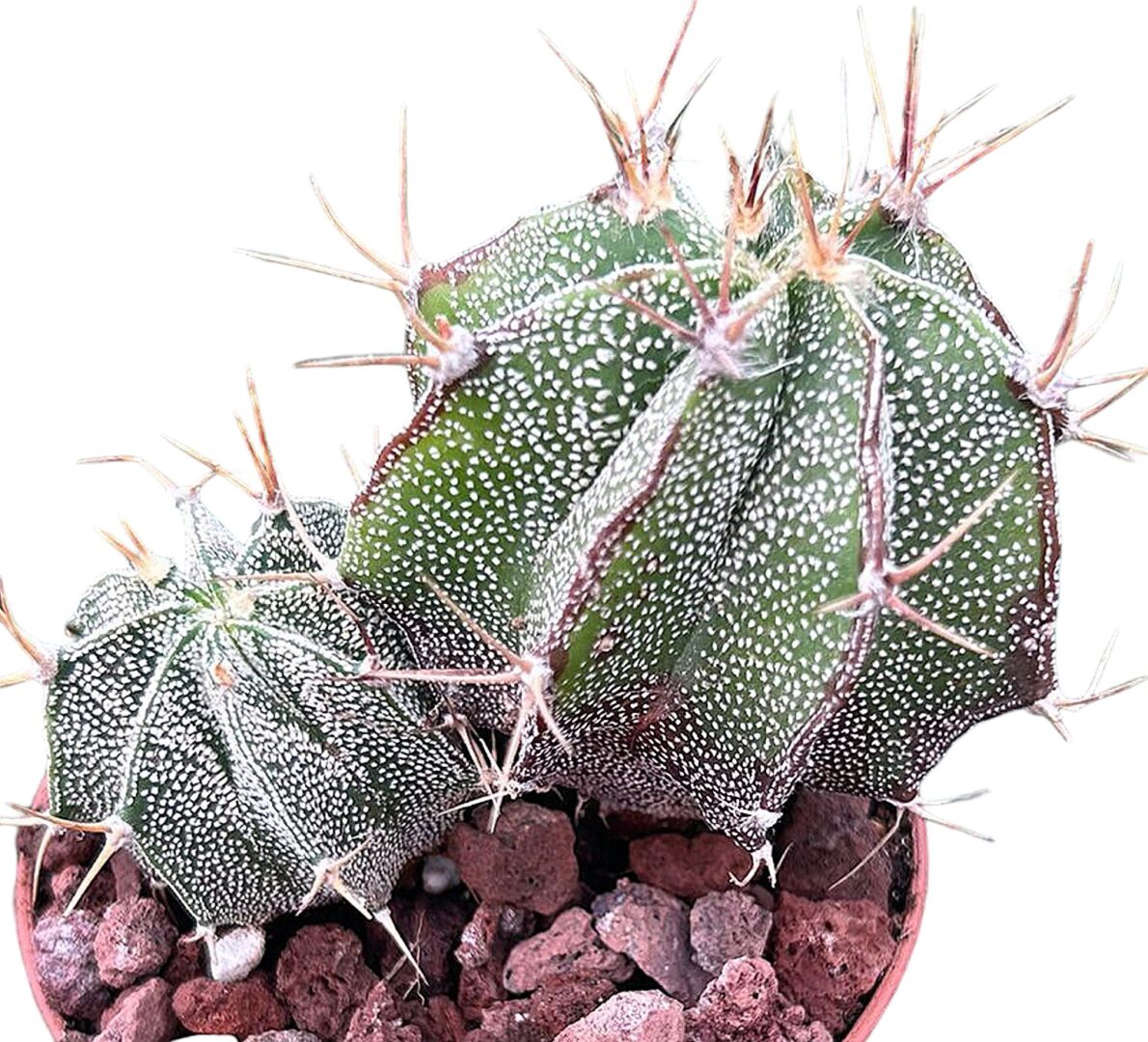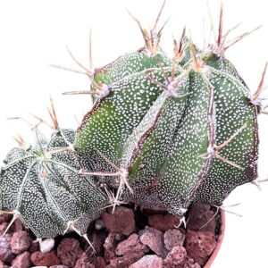 Si estás buscando un cactus que rompa todos los esquemas, el Astrophytum capricorne es tu candidato ideal. Esta maravilla del desierto combina lo mejor del mundo cactus: es exótico, resistente y tremendamente decorativo. Originario del norte de México, este cactus destaca por su forma globosa o cilíndrica, sus costillas perfectamente marcadas y, sobre todo, por sus espinas largas, curvadas y enmarañadas, ¡que le dan un aire de cabra montesa salvaje! Su nombre no es casual: “capricorne” significa “cuerno de cabra”, y basta con ver sus espinas rizadas y retorcidas para entender por qué. Pero no te dejes engañar: detrás de ese aspecto rudo, se esconde un cactus noble, elegante y con una floración espectacular. En los meses cálidos, este campeón nos regala flores grandes, amarillas y sedosas con el centro rojizo, que parecen pequeñas joyas emergiendo del desierto.