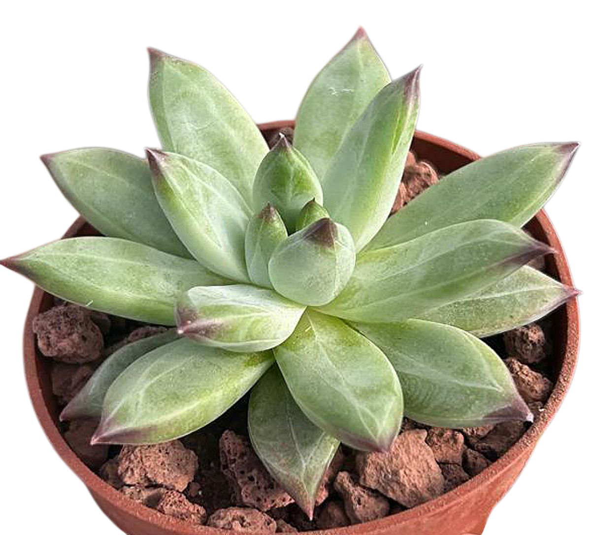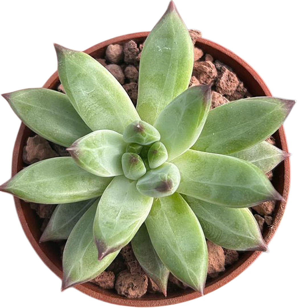 ¿Te imaginas una planta que combine lo mejor de dos mundos suculentos? ¡Existe y se llama Pachyphytum compactum x Echeveria tolimanensis! Este precioso híbrido, también conocido como Pachyveria Bea, es un espectáculo natural que enamora a primera vista con su estructura compacta, su brillo pastel y sus formas geométricas que parecen esculpidas con esmero. Su aspecto es simplemente fascinante: una roseta perfectamente simétrica, formada por hojas carnosas en tonos que van del verde azulado al lavanda y rosa suave, cubiertas por una delicada capa de pruina que le da un efecto empolvado muy elegante. Esta suculenta no solo destaca por su belleza, sino también por su resistencia y facilidad de cuidado, lo que la convierte en la elección ideal para cualquier nivel de experiencia.