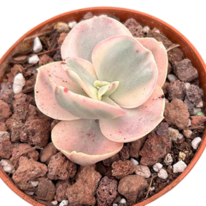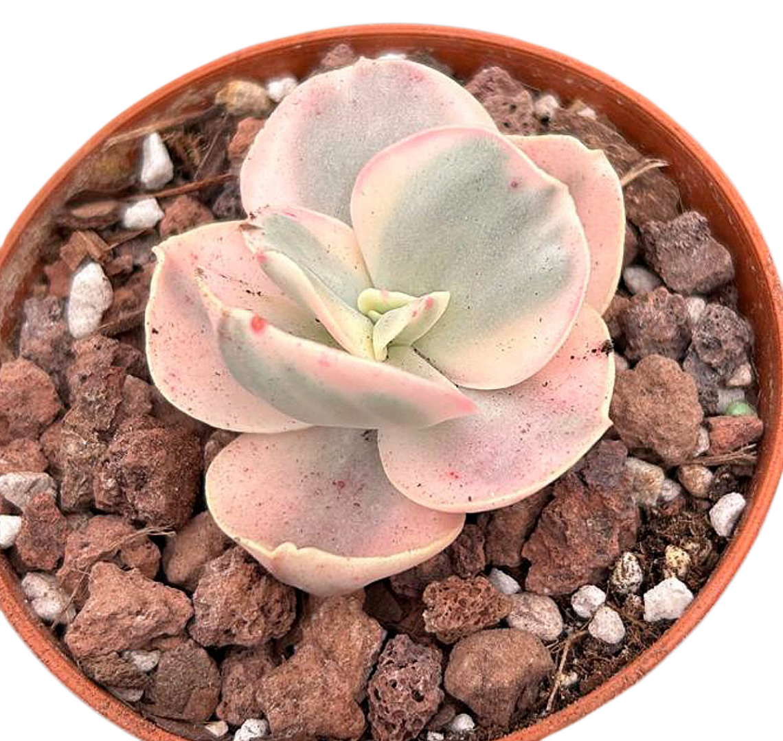 ¡Descubre la magia de los matices con la Echeveria Suyon Variegada! Si ya te habías enamorado de la versión clásica de la Suyon, prepárate para quedar completamente encantado con esta versión variegada, ¡una verdadera obra de arte viva! Sus hojas en tonos crema, verde menta, rosa suave y lila pastel parecen pintadas a mano, y su forma de roseta compacta y perfecta la convierte en la estrella de cualquier colección de suculentas.