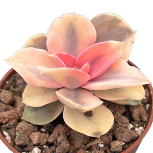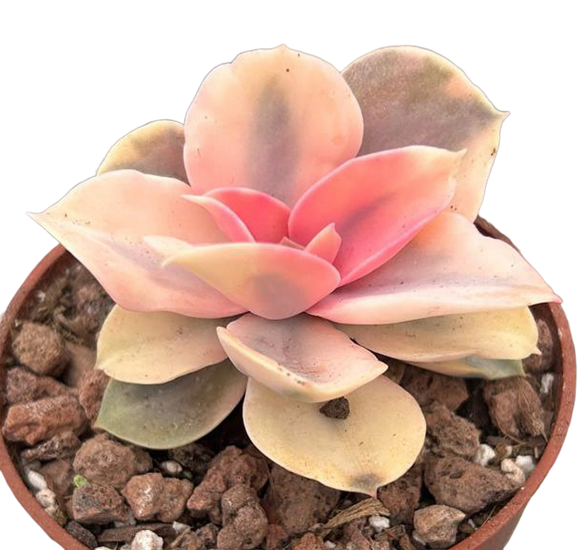 Originaria de México y Centroamérica, la Echeveria Rainbow se ha ganado su nombre gracias a sus hojas carnosas y compactas que parecen pintadas a mano con pinceladas de colores pastel y vibrantes, combinando tonos claros y oscuros que cambian según la estación y la cantidad de luz. Su forma de roseta perfecta y sus bordes delicadamente coloreados hacen que sea una planta tan decorativa como resistente.