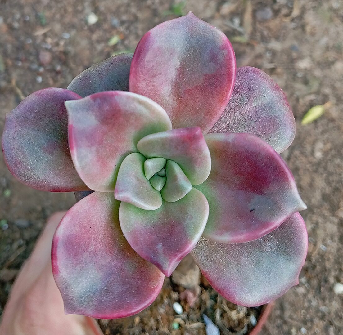El Graptopetalum Foie Gras se presenta con hojas carnosas y redondeadas que parecen pequeñas gotas de terciopelo vegetal. Sus tonos varían del rosa pálido al lavanda suave, con un acabado empolvado que le da una apariencia etérea, como si hubiera sido espolvoreado con azúcar glas. Bajo buena iluminación, sus tonos se intensifican, regalando un espectáculo cromático que parece sacado de un cuento.
