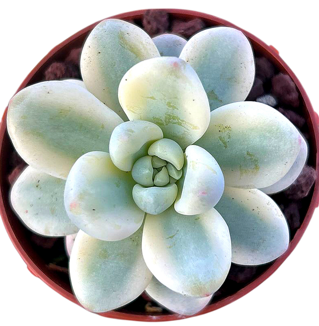 ¡Déjate conquistar por el encanto irresistible del Sedum clavatum variegado! Esta hermosa suculenta no solo enamora con su apariencia compacta y simétrica, sino que también ilumina cualquier rincón con sus delicados matices en tonos verde pastel, crema y toques rosados cuando recibe suficiente sol. ¡Es como tener una pequeña obra de arte viva en casa!